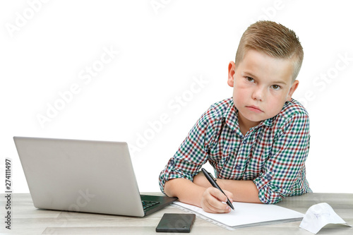 Caucasian school-age boy in a plaid shirt sitting at the table and writing in a piece of paper . there is also a laptop and a phone on the table