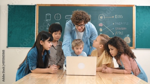 Caucasian teacher and diverse student looking at laptop at classroom. Cute multicultural children learning about coding program or generated program by using software while teacher teaching. Pedagogy.