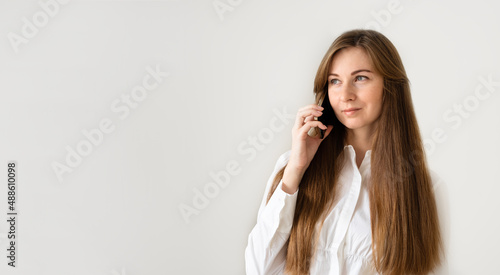 Caucasian woman with long brown hair smiling, speaking by smartphone,having call on phone on white,grey background at home or office.Banner,copy space