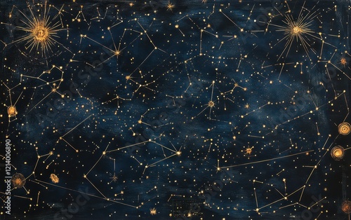 Celestial Map of Constellations with Golden Stars on Dark Blue Textured Background.