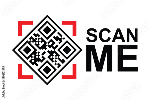 Centered black and white QR code with bold red framing squares. "SCAN ME" in modern sans-serif font below on clean white background. High-contrast, minimalist design for easy scanning functionality.