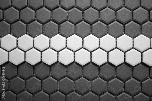 Ceramic tiles mosaic made of gray rhombuses with a white stripe in the middle, without grouting, the mesh-base and glue is visible. The concept of repair. Background.