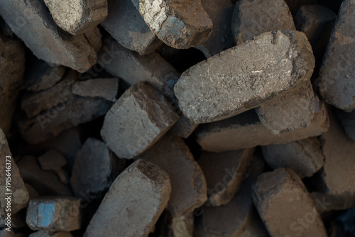Charcoal briquettes used for barbecue. Charcoal for hookah, pieces of charcoal for water pipes in close-up. An industrial pile of briquettes, bricks.