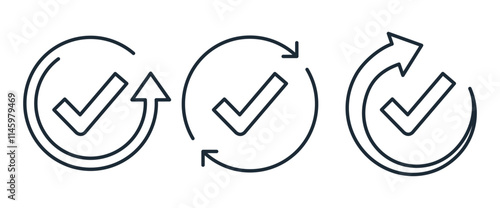 Check mark and confirm. Done symbol. Complete task, tick , correct test. Vector linear icon isolated on white background.