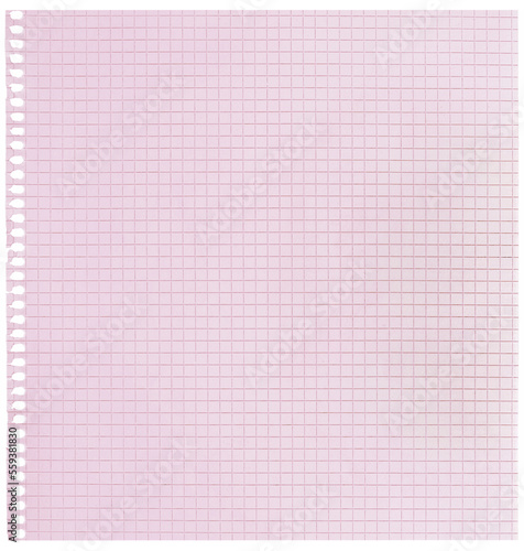 Checked spiral notebook page paper background, old aged pink chequered ring binder sheet flat lay A4 copy space, vertical squared pattern maths notepad, torn out isolated blank empty notepaper