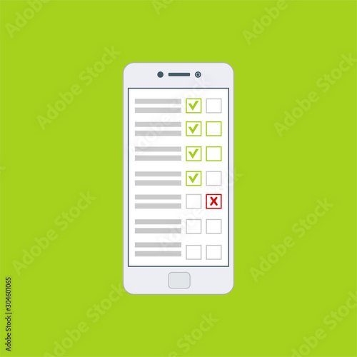 Checklist on smartphone screen. One hand holds smartphone and finger touch screen. Flat vector illustration.Can be used for workflow layout template, banner, marketing, infographics.