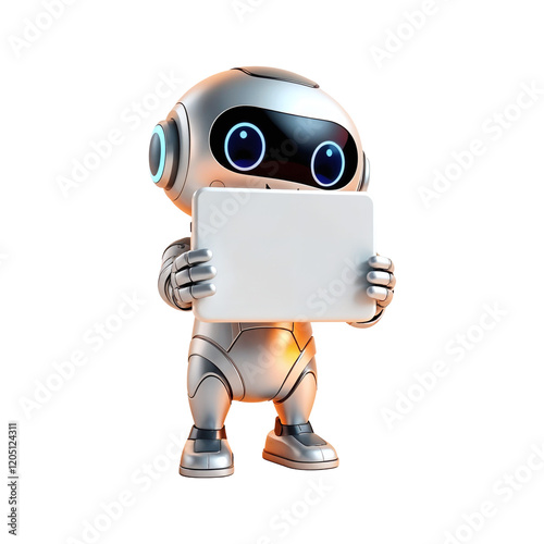Cheerful 3D Robot Holding a Blank Tablet
