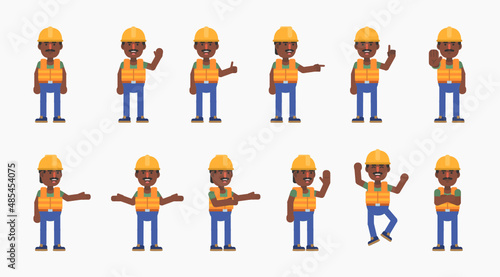 Cheerful black or indian construction worker showing various hand gestures. Builder with hard hat pointing, greeting, showing thumb up and other hand gestures. Modern vector illustration