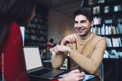 Cheerful man sitting with female student and talking about joint project