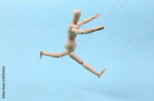 Cheerful wooden puppet jumping on blue background
