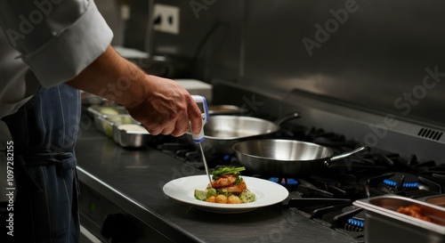 Chef plating gourmet dish in professional kitchen