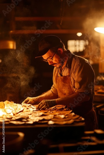 Chef prepares food in a warm kitchen