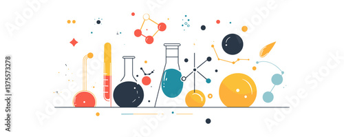 Chemistry laboratory equipment with colorful molecules and abstract shapes - vector.