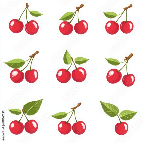 Cherry fruit vector set with simple logo design featuring cherry pattern and leaves on a white background