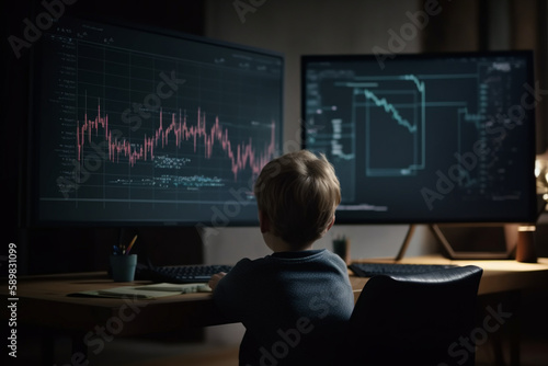 Child sitting bihind computer screen displaying multiple financial reports and graphs. Generative AI