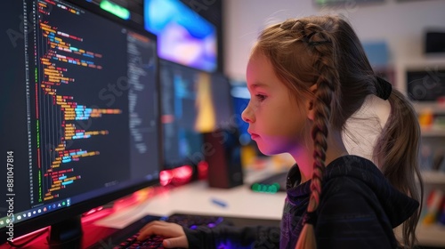Child with a computer, coding on screen, aspiring programmer, tech career