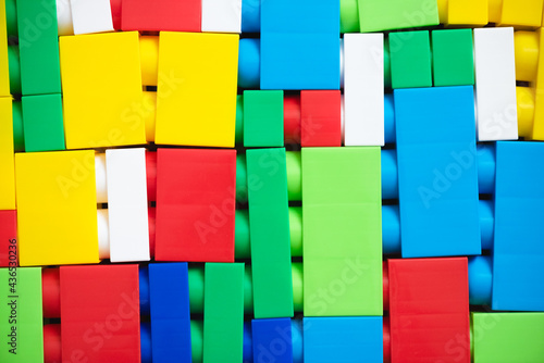 Children building kit abstract flat lay background.