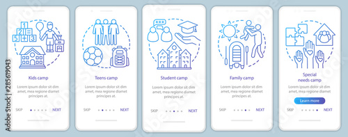 Children camps onboarding mobile app page screen vector template. Kids and family holiday. Walkthrough website steps with linear illustrations. UX, UI, GUI smartphone interface concept