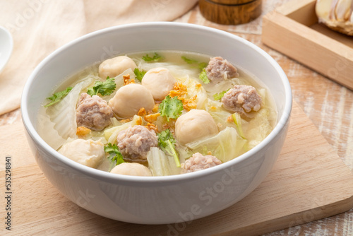 Chinese Cabbage Soup with Minced Pork and meatball in white bowl.Thai style clear soup
