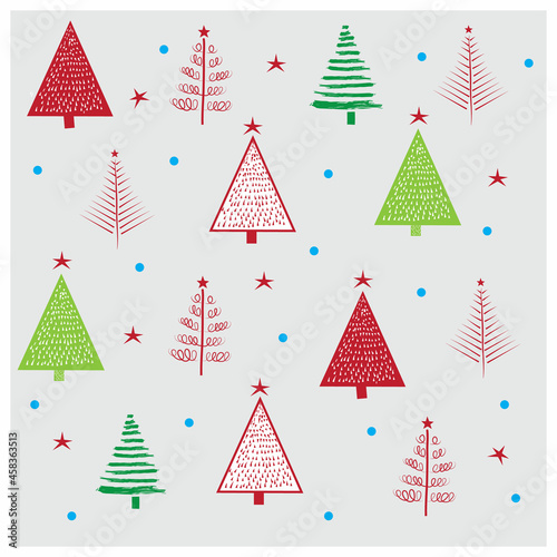 Christmas trees vector border. Seamless pattern hand drawn doodle trees, green, red.