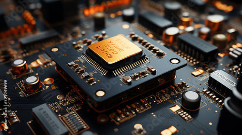 Circuit board background. CPU chip on Motherboard. Abstract 3D render of a processor computer chip on a circuit board with microchips and other computer parts. Electronic circuit board close up.
