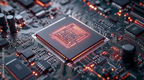 circuit board, components, functional Close-up of a microprocessor on a circuit board with glowing elements.