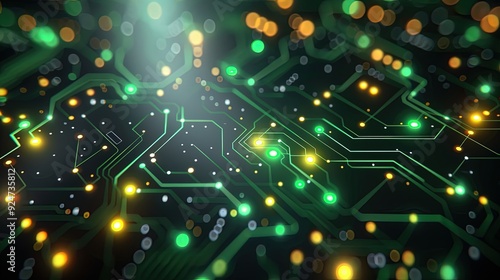 Circuit board microchips with green backlight. Nanotechnology sustainable background.