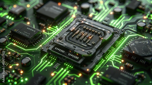 Circuit board microchips with green backlight. Nanotechnology sustainable background.