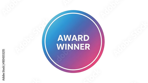 Circular award winner badge with a blue to pink gradient background and white text stating 'award winner' inside a white border, representing achievement