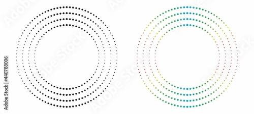 Circular pattern of dots fading to x-axis. Set with two alternatives of circular pattern of dots. One frame in black and white, one colorful. Isolated on white background. Vector illustration. EPS10.