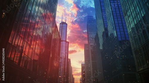 City skyline at sunset, vibrant colors reflected in modern skyscrapers