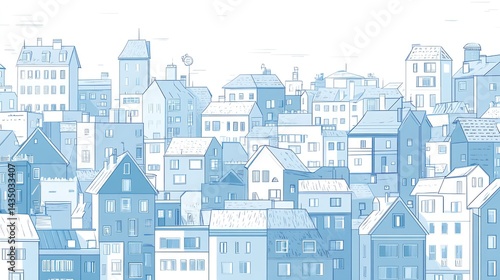 Cityscape Panorama, Light Blue Sketch, Urban, Detailed, Background, Illustration, Use Stock Photo