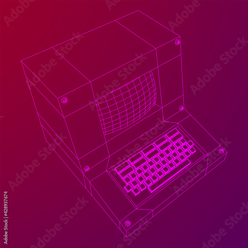 Classic retro perconal computer. Programming code concept. Wireframe low poly mesh vector illustration