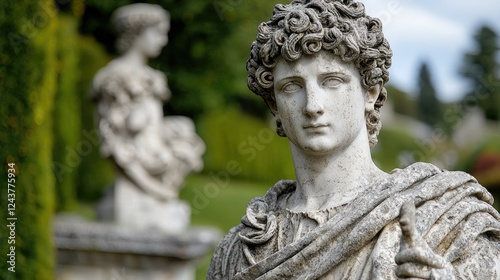 Classical statue in garden, serene background
