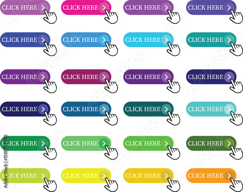 Click Here Button Icon set.Pointer Click button. Modern action button mouse click symbol. Computer mouse click cursor or Hand pointer symbol. Cursor arrow icon. Clicking finger. Vector illustration.