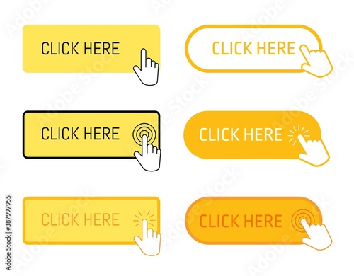 Click here press or select button with call to action text and cursor pointer for flat UI or application graphic design. Software navigation element vector illustration isolated on white background