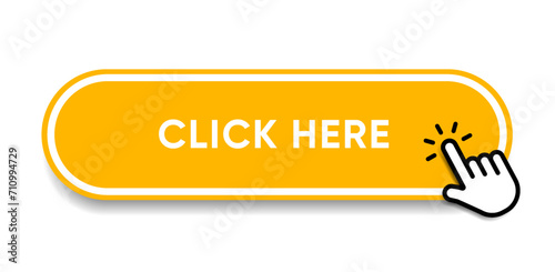 Click here web buttons with hand cursor. Set of action button with arrow pointer. Click button. Modern action button mouse click symbol. Computer mouse click cursor or Hand pointer symbol.