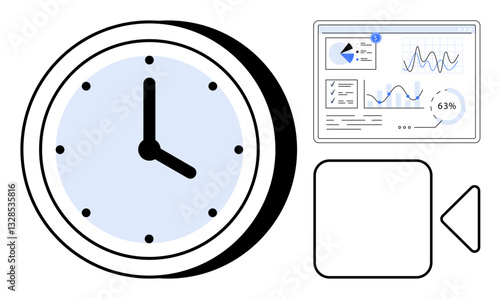 Clock, analytics dashboard with graphs, play button, and media panel highlighting data tracking, time focus. Ideal for scheduling, productivity, data review, time planning workflow efficiency flat