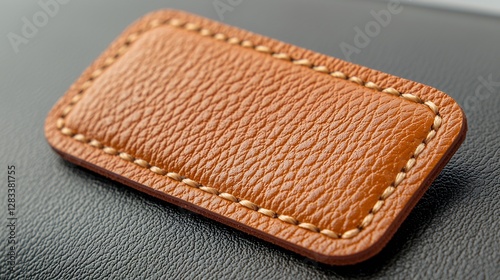 Close Up Brown Leather Rectangular Patch with Stitching on a Black Surface