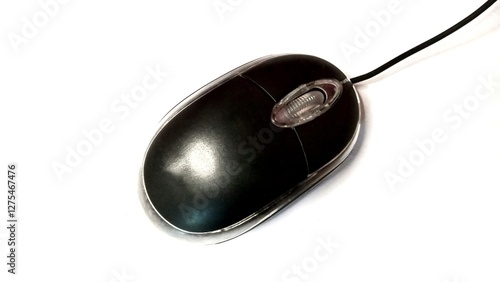 Close up of a black wired computer mouse isolated on white. Technology, computing, input device concept.