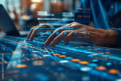 Close up of a businessman's hands using multiple devices to work on updating tasks and scheduling in a virtual Gantt chart diagram in an office setting.