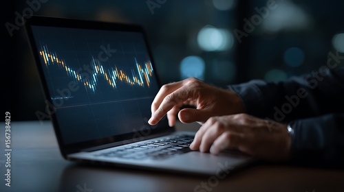 Close up of a person s hands typing on a laptop displaying a financial stock market candlestick chart