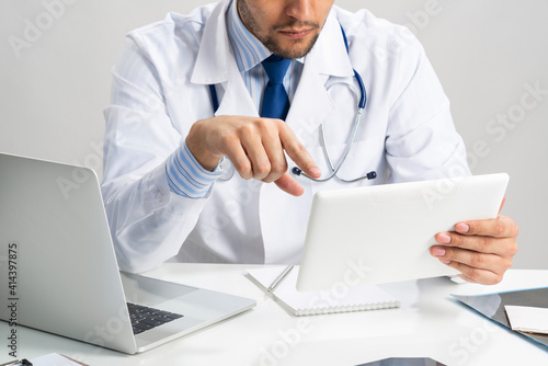 Close up of doctor hands using tablet computer