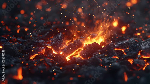 Close up of glowing hot coals and flames in the fire pit for grilling, commercial photo background. Charcoal Smudging. Illustration