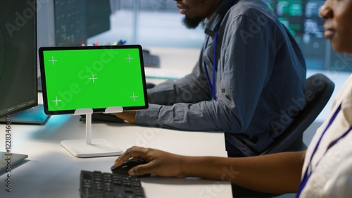 Close up of green tablet in server room used by system administrators to ensure minimal downtime. Data center software developers looking at chroma key device, monitoring performance, camera A