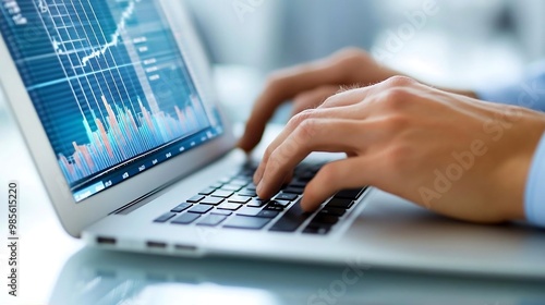 Close Up of Hands Typing on Laptop with Financial Charts Displayed on Screen