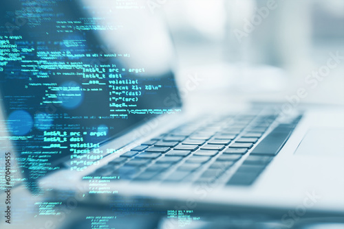 Close up of laptop on desk with creative coding html language on blurry background. Web developer and programming concept. Double exposure.