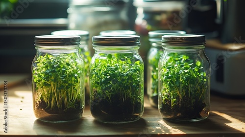 Close up of mason jars filled with soil and sprouting green plants on a wooden surface indoors