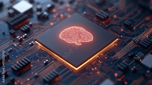 Close up of microchip with glowing brain design, symbolizing artificial intelligence and technology. intricate circuit patterns highlight advanced nature of modern computing.