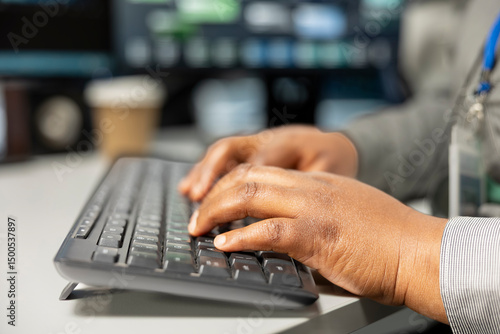 Close up of server room software developer using computer to implement data backup solutions. Data center employee typing on PC keyboard, resolving technical errors, ensuring efficient recovery